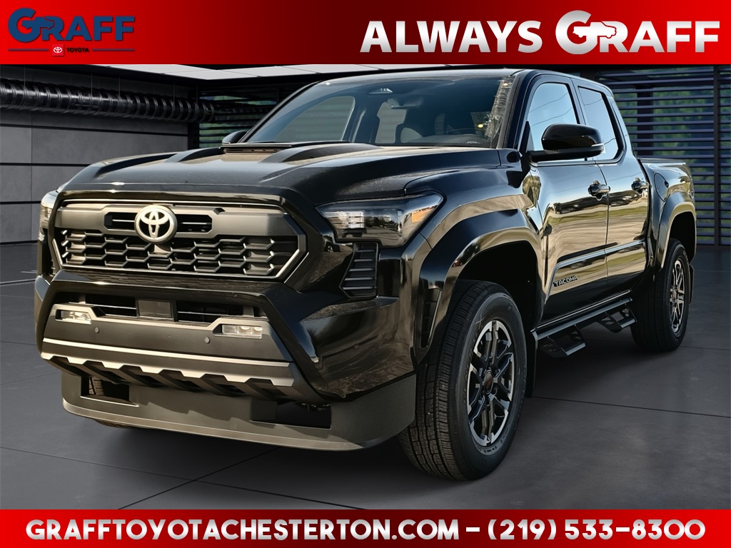 Comments: 2025 Toyota Tacoma TRD Sport Black4WD 8-Speed Automatic 2.4L 4-Cylinder4WD, 120V/400W AC Power Inverter, 4-Wheel Disc Brakes, 6 Speakers, 8-Way Power Driver & Passenger Seat Adjusters, ABS brakes, Air Conditioning, All Weather Floor Liners (TMS), Anti-whiplash front head restraints, Apple CarPlay/Android Auto, Auto High-beam Headlights, Auto-dimming Rear-View mirror, Automatic temperature control, Brake assist, Deck Storage Box, Dual front impact airbags, Dual front side impact airbags, Electronic Stability Control, Emergency communication system: Safety Connect (1-year trial), Exterior Parking Camera Rear, Four wheel independent suspension, Front anti-roll bar, Front Bucket Seats, Front fog lights, Front reading lights, Fully automatic headlights, Heated door mirrors, Heated Front Seats, Heated Leather-Trimmed Steering Wheel, HomeLink Universal Transceiver, Illuminated entry, Integrated Trailer Brake Controller, JBL Premium Audio, Knee airbag, Leather Shift Knob, Leather steering wheel, Low Auxiliary (30A) Switches, Low tire pressure warning, Moon Roof, Multimedia Screen Protector - Glass (TMS), Occupant sensing airbag, Overhead airbag, Power Horizontal Rear Window, Pre-Wire Accommodation (Bed Power Port), Radio: 8 Toyota Audio Multimedia, Rear step bumper, Rear window defroster, Remote keyless entry, Smart Key w/Digital Key Technology, SofTex Seat Trim, Speed control, Speed-sensing steering, Telescoping steering wheel, Tilt steering wheel, Traction control, TRD Sport Upgrade Package, Turn signal indicator mirrors, Wheels: 18 TRD Sport Alloy.Welcome to Graff Toyota – Northwest Indiana’s Newest Premier Auto Dealer, Now Open in Burns Harbor Discover Graff Toyota, proudly serving Burns Harbor, Valparaiso, Chesterton, and the entire Northwest Indiana region as the area’s newest premier Toyota dealership. As part of a trusted, family-owned dealership group, Graff Toyota brings a community-first, family-focused approach to car buying—delivering honest service, unbeatable value, and the latest Toyota models in a convenient, central location. Located just off I-80/94, Graff Toyota offers easy access for customers across Northwest Indiana and Chicagoland. Whether you're in Portage, Michigan City, or commuting from Chicago, we’re only minutes away—and our remote delivery service means we can bring your new vehicle right to your driveway. Experience the difference of working with a dealership that’s committed to community, convenience, and customer care. At Graff Toyota, we make it easy for you to browse, buy, and drive—locally or remotely. Always Graff!!!