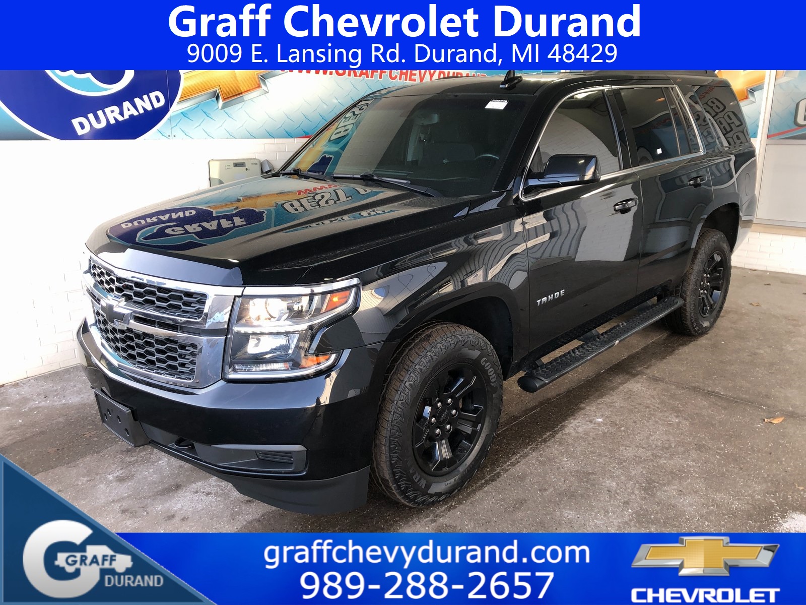 Comments: 2019 Chevrolet Tahoe LS EcoTec3 5.3L V8 6-Speed Automatic Electronic with Overdrive BlackVehicle features include: 4WD, Jet Black Cloth, 1st & 2nd Row Color-Keyed Carpeted Floor Mats, 2 Front Frame-Mounted Black Recovery Hooks, 2nd Row 60/40 Split-Folding Manual Bench, 3rd Row Manual 60/40 Split-Folding Fold Flat Bench, 3rd Row Passenger Seat Delete, 4-Wheel Antilock Disc Brakes w/Brake Assist, 5 12-Volt Auxiliary Power Outlets, Black Assist Steps, Black Tubular Assist Steps, Cargo Net, Color-Keyed Carpeting Floor Covering, Custom Midnight Edition, Electronic Cruise Control w/Set & Resume Speed, Extended-Range Remote Keyless Entry, Front & Rear Black Bowties, Front Passenger 6-Way Power Seat Adjuster, Leather-Wrapped Steering Wheel, Preferred Equipment Group 1LS, Premium Smooth Ride Suspension Package, Rear Park Assist w/Audible Warning, Remote Vehicle Start, Roof-Mounted Luggage Rack Side Rails, SiriusXM Radio, Wheels: 18 Black Painted Aluminum.Recent Arrival!Awards: * JD Power Initial Quality Study * 2019 KBB.com Best Resale Value AwardsAt Graff Chevrolet in Durand, we want to revolutionize the car buying experience by making it fun. After all, getting behind the wheel of a new car should be exciting!