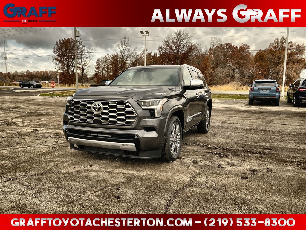 Comments: 2026 Toyota Sequoia Capstone Magnetic Gray Metallic4WD 10-Speed Automatic V6 HybridV6 Hybrid, 10-Speed Automatic, 4WD, 14 Speakers, 3rd row seats: split-bench, 4-Wheel Disc Brakes, ABS brakes, Air Conditioning, Alloy wheels, Apple CarPlay/Android Auto, Auto High-beam Headlights, Auto-dimming door mirrors, Auto-dimming Rear-View mirror, Automatic temperature control, Brake assist, Delay-off headlights, Dual front impact airbags, Dual front side impact airbags, Electronic Stability Control, Emergency communication system: Safety Connect (10-year trial), Exterior Parking Camera Rear, Front anti-roll bar, Front Bucket Seats, Front dual zone A/C, Front fog lights, Front reading lights, Front wheel independent suspension, Fully automatic headlights, Headlight cleaning, Heated door mirrors, Heated front seats, Illuminated entry, Knee airbag, Leather steering wheel, Low tire pressure warning, Memory seat, Occupant sensing airbag, Overhead airbag, Power door mirrors, Power driver seat, Power moonroof, Power steering, Power windows, Premium audio system: JBL, Radio: 14 Toyota Audio Multimedia w/JBL Prem Aud, Rear air conditioning, Rear seat center armrest, Rear window defroster, Reclining 3rd row seat, Remote keyless entry, Speed control, Split folding rear seat, Spoiler, Steering wheel mounted audio controls, Telescoping steering wheel, Tilt steering wheel, Traction control, Turn signal indicator mirrors, Variably intermittent wipers, Voltmeter.Welcome to Graff Toyota – Northwest Indiana’s Newest Premier Auto Dealer, Now Open in Burns Harbor Discover Graff Toyota, proudly serving Burns Harbor, Valparaiso, Chesterton, and the entire Northwest Indiana region as the area’s newest premier Toyota dealership. As part of a trusted, family-owned dealership group, Graff Toyota brings a community-first, family-focused approach to car buying—delivering honest service, unbeatable value, and the latest Toyota models in a convenient, central location. Located just off I-80/94, Graff Toyota offers easy access for customers across Northwest Indiana and Chicagoland. Whether you're in Portage, Michigan City, or commuting from Chicago, we’re only minutes away—and our remote delivery service means we can bring your new vehicle right to your driveway. Experience the difference of working with a dealership that’s committed to community, convenience, and customer care. At Graff Toyota, we make it easy for you to browse, buy, and drive—locally or remotely. Always Graff!!!