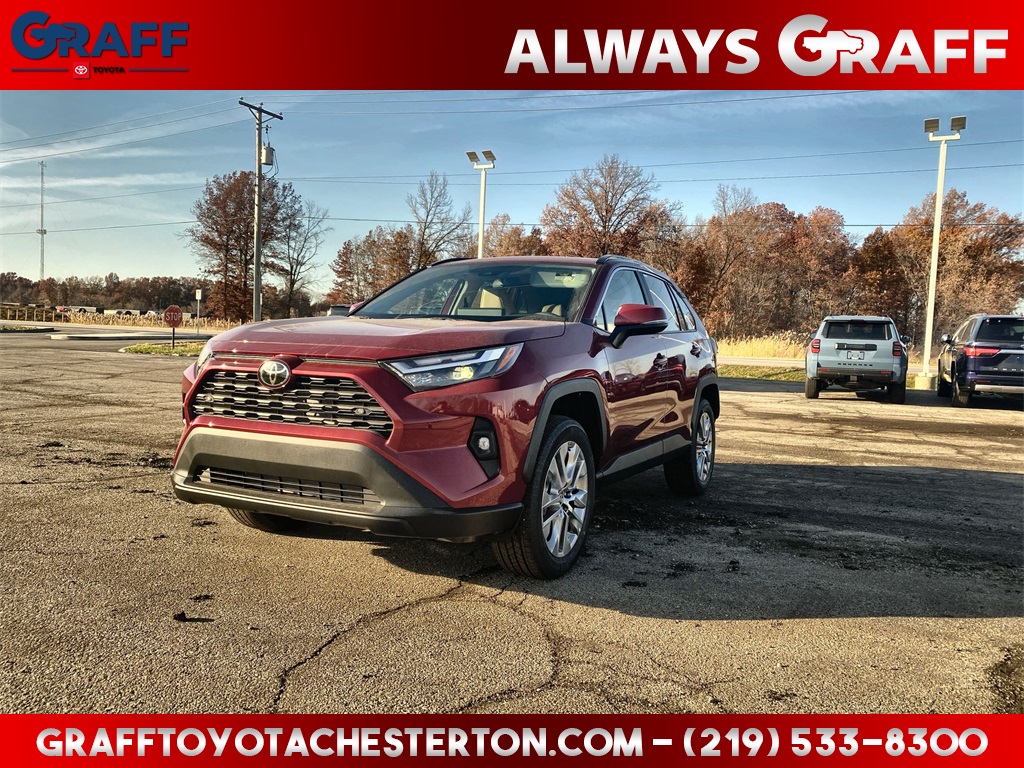 Comments: 2025 Toyota RAV4 XLE Premium Ruby Flare PearlAWD 8-Speed Automatic 2.5L 4-Cylinder DOHC Dual VVT-iAWD, Nutmeg Artificial Leather, 3 Spoke Leather Heated Steering Wheel, 4-Wheel Disc Brakes, 6 Speakers, ABS brakes, Advanced Technology Package, Air Conditioning, All Weather Floor Liners & Cargo Liner (TMS), Auto High-beam Headlights, Automatic temperature control, Black Chrome Exhaust Tip (TMS), Blackout Emblem Overlays (TMS), Blind Spot Monitor w/Lane Change Assist, Brake assist, Delay-off headlights, Driver Seat w/2-Position Memory Function, Dual front impact airbags, Dual front side impact airbags, Electronic Stability Control, Emergency communication system: Safety Connect (10-year trial), Exterior Parking Camera Rear, Four wheel independent suspension, Front anti-roll bar, Front Bucket Seats, Front dual zone A/C, Front Seat Heating, Fully automatic headlights, Heated door mirrors, Illuminated entry, Intelligent Clearance Sonar, Knee airbag, Leather Shift Knob, Leather steering wheel, Low tire pressure warning, Occupant sensing airbag, Overhead airbag, Parking Support Alert & Brake, Power door mirrors, Power driver seat, Power Liftgate, Power moonroof, Power steering, Power windows, Radio data system, Radio: AM/FM/XM Audio System, Rear anti-roll bar, Rear window defroster, Remote keyless entry, Speed control, Speed-sensing steering, Steering wheel mounted audio controls, Telescoping steering wheel, Tilt steering wheel, Traction control, Turn signal indicator mirrors, Weather Package, Wheels: 19 5-Spoke Silver Alloy, Wireless Phone Charger, XLE Premium Package.Welcome to Graff Toyota – Northwest Indiana’s Newest Premier Auto Dealer, Now Open in Burns Harbor Discover Graff Toyota, proudly serving Burns Harbor, Valparaiso, Chesterton, and the entire Northwest Indiana region as the area’s newest premier Toyota dealership. As part of a trusted, family-owned dealership group, Graff Toyota brings a community-first, family-focused approach to car buying—delivering honest service, unbeatable value, and the latest Toyota models in a convenient, central location. Located just off I-80/94, Graff Toyota offers easy access for customers across Northwest Indiana and Chicagoland. Whether you're in Portage, Michigan City, or commuting from Chicago, we’re only minutes away—and our remote delivery service means we can bring your new vehicle right to your driveway. Experience the difference of working with a dealership that’s committed to community, convenience, and customer care. At Graff Toyota, we make it easy for you to browse, buy, and drive—locally or remotely. Always Graff!!! 27/33 City/Highway MPG