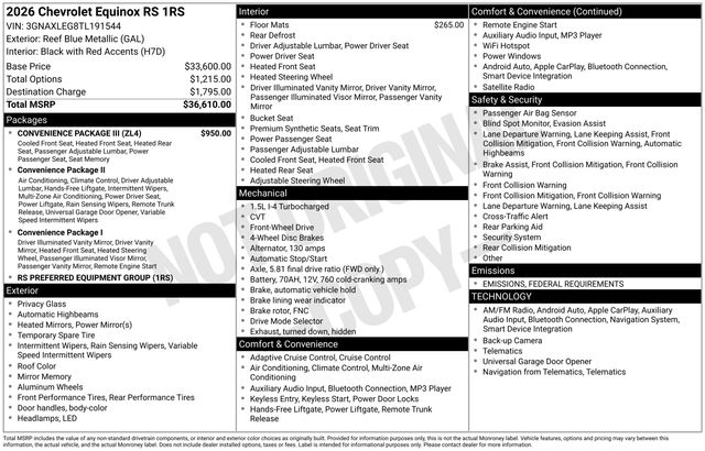 Reef Blue Metallic 2026 Chevrolet Equinox RS 1.5L DOHC CVT FWDOur team is dedicated to getting you the best price and all the information you need to make an informed decision! Any vehicles showing in our inventory are on our lot, not at another store miles away. We believe in transparent pricing and we do not charge dealer fees or add any additional surprise fees to our prices. 26/28 City/Highway MPGCall Graff today at 989-684-4411 to confirm availability! Note: Internet prices are not compatible with other offers unless specified by dealer.